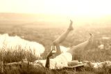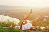 Young beautiful happy woman with white wine in hand is lying on the blanket and enjoying perfect time at summer picnic.