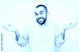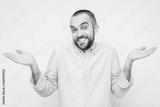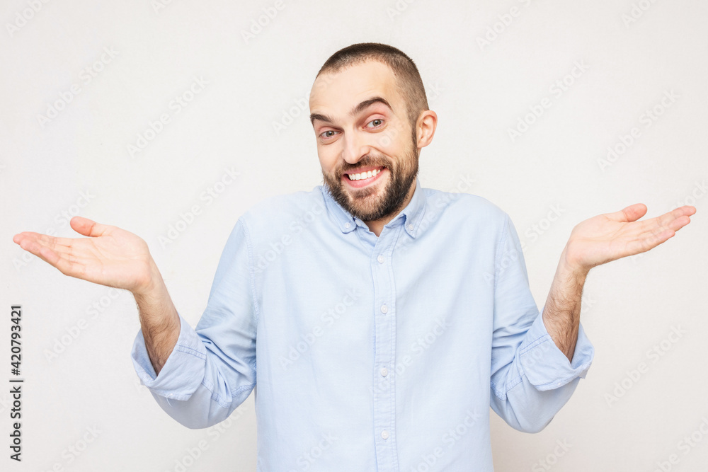 Smiling confused man shrugs, portrait, white background