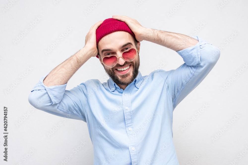 Puzzled bearded in love wears pink glasses in the shape of a heart, portrait, white background
