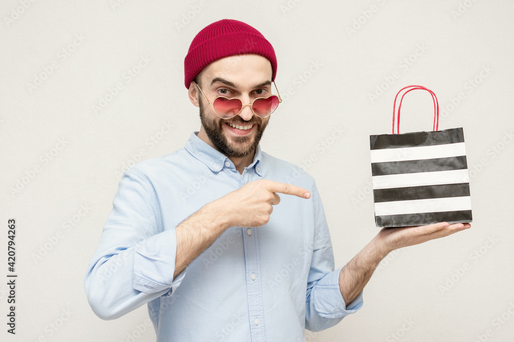 Bearded man points to the shopping bag, mman with the glasses in the shape of a heart shows buy, portrait, white background