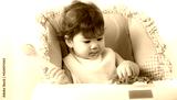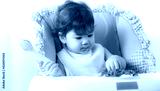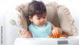 Adorable little toddler girl or infant baby eating delicious spaghetti food with tomato sauce. Funny cute infant girl get hungry and eating food by using hand. Mix race daughter get dirty all body