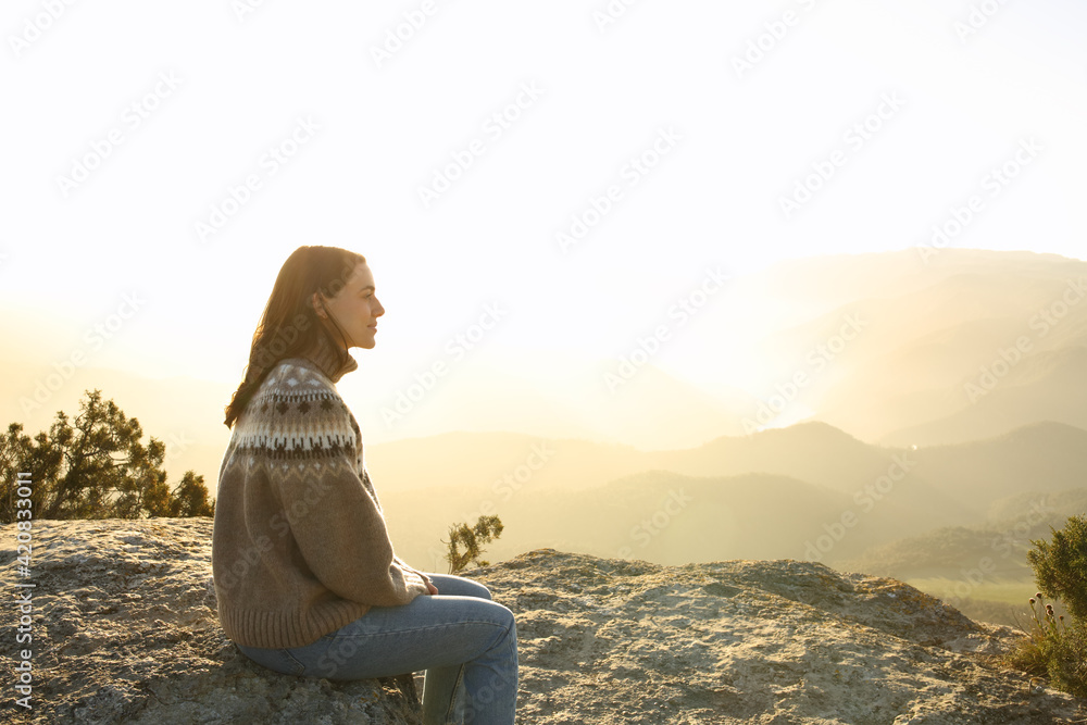 Casual woman in the top of a cliff contemplating in winter