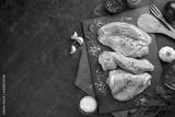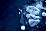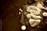 Three pieces of turkey fillet on a slate board with spices and garlic on a black background.