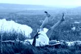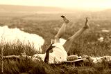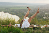 Young beautiful happy woman with closed eyes and glass of wine in hand lying on the green grass, enjoying picnic.