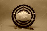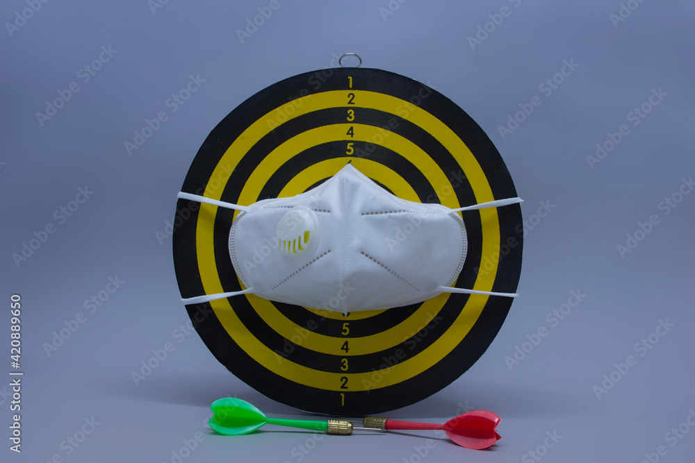 Medical mask from Covid-19 on the background of darts. The concept of mask mode and health protection from a pandemic.