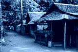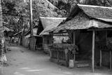 Rustic wooden huts street asian village. Native lifestyle travel photo. Traditional lifestyle of fishermen on sea shore. South Asia indigenous people living. Palm leaf roof on bamboo house