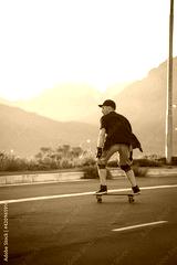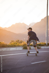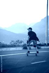 Skateboarder skateboarding on an open road doing freestyle tricks