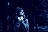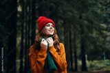 Happy woman in autumn sweater on the nature in the forest and a red hat
