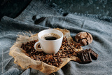 Coffee cup, coffee beans, chocolate, anise and tasty cookie