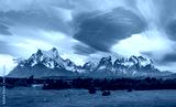 Guanacos grazing in front of Torres Del Paine mountain range with lenticular clouds
