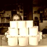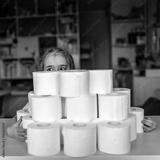 A cute girl sitting near the heap of toilet paper, basic thing in emergency coronavirus kit, prepare for self-isolation, healthcare and personal hygiene