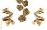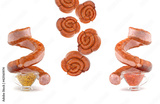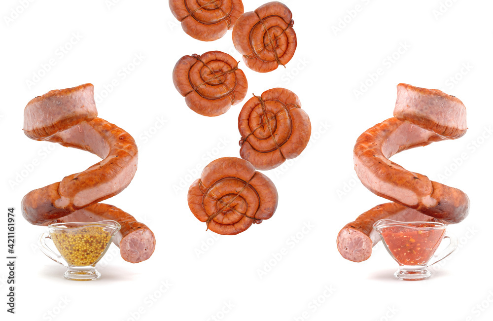 A smoked sausage, twisted in a spiral, levitates over a mustard sauce isolated on a white background.