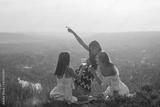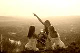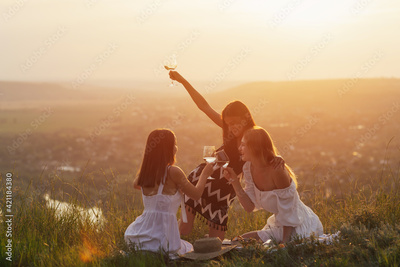 Beautiful young girls girlfriends on a picnic on a summer sunny day drinking wine and enjoy perfect time together.