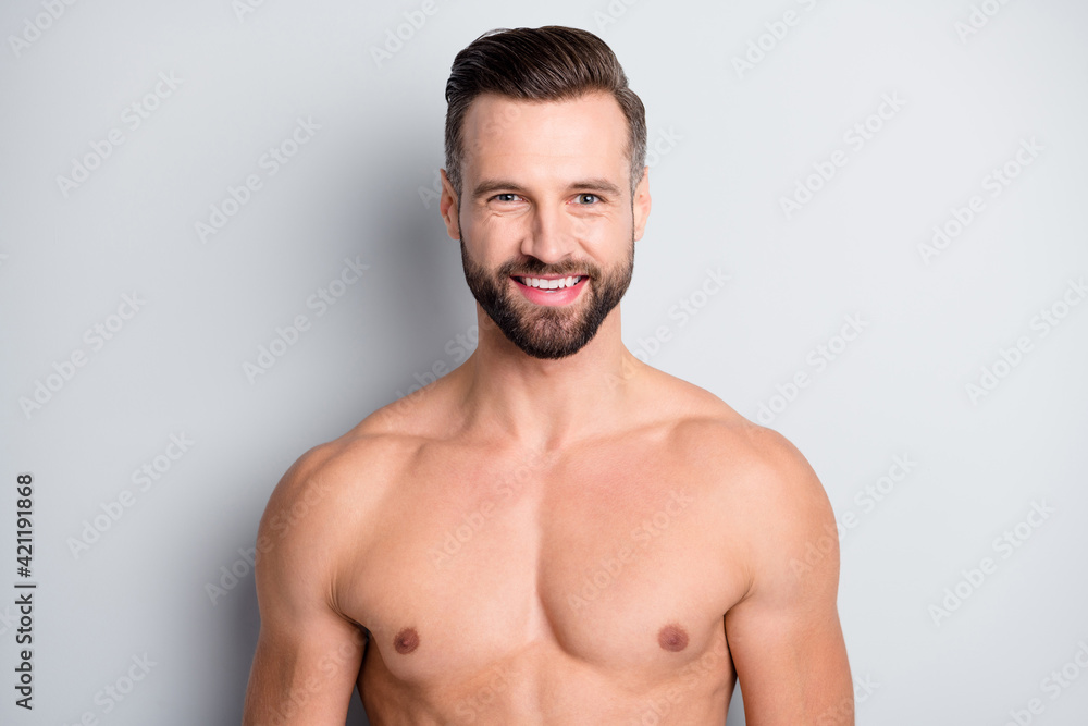 Photo of young handsome brown hair man happy positive smile pure perfect skin isolated over grey color background