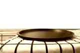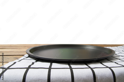 Baking dish. Plaid tablecloth. Brown wooden table isolated background. Mock up top view. Kitchen Copy space, empty food place. Thanksgiving day. Pie dessert, biscuit clean bakery form. Selective focus