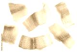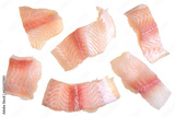 Pangasius fish fillet, pieces on a green lettuce leaf. Isolated on a white background. Fresh Fish Fillet.