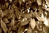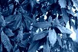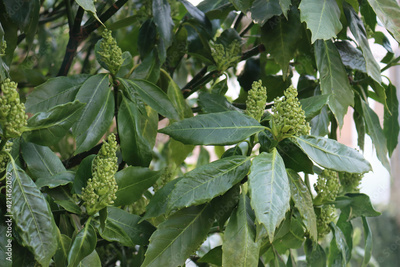Aucuba japonica bush commonly called japanese laurel with fresh blossoms on branch in the garden