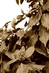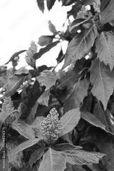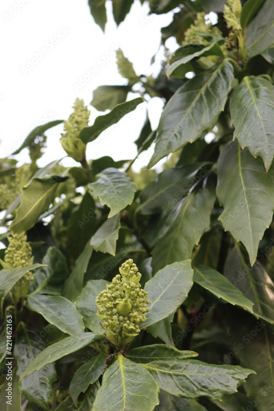 Aucuba japonica bush commonly called japanese laurel with fresh blossoms on branch in the garden
