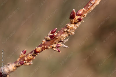 Close-up of Forsythia blossoms on branch on winter season. Forsythia bush in the garden