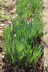 Daffodil plants growing in the garden in springtime. Narcissus plant