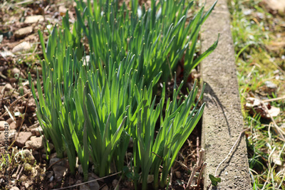 Daffodil plants growing in the garden in springtime. Narcissus plant