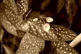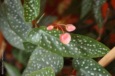 Angel wing Begonia with pink flowers. begionia in bloom with spotted green leaves