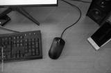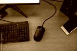 Black gaming mouse with keyboard and mobile phone on wooden stand on wooden table