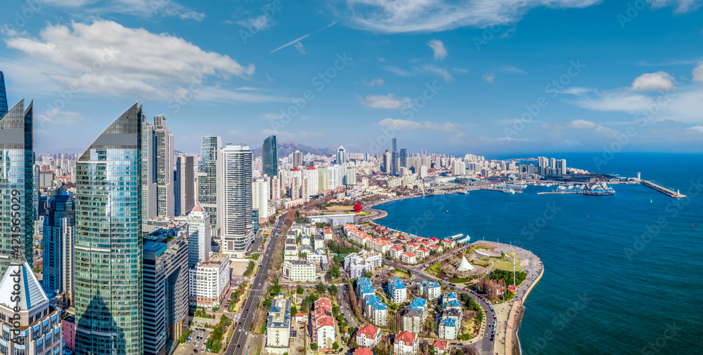 Aerial photography of the modern city coastline architectural landscape of Qingdao, China