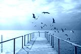 Seagulls fly from the pier to the sea in sunny weather