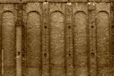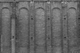 A wide old brick wall with recesses and protruding parts.