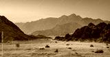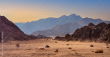 Mountain landscape in a stone desert with silhouettes of high hills at sunset. Extreme adventures on tourist transport in desert, off-road trips and active leisure for tourist in Egypt.