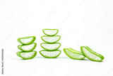 Slices of fresh aloe vera plant stacked and aloe vera stalk or leaves with water dropping isolate on white background.