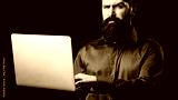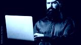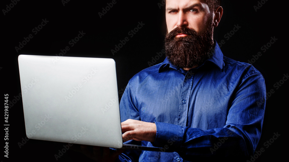 Bearded male businessman holding a computer in his hands isolated on black background. Young businessman using his laptop, pc