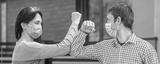 Elbows bump. Friends in protective medical mask on his face greet their elbows in quarantine. Elbow bump