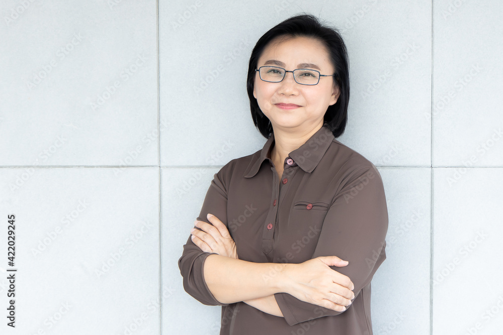 Portrait of good looking and kindly warm feeling Asian senior woman wearing eyeglasses standing and smiling with positive face