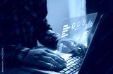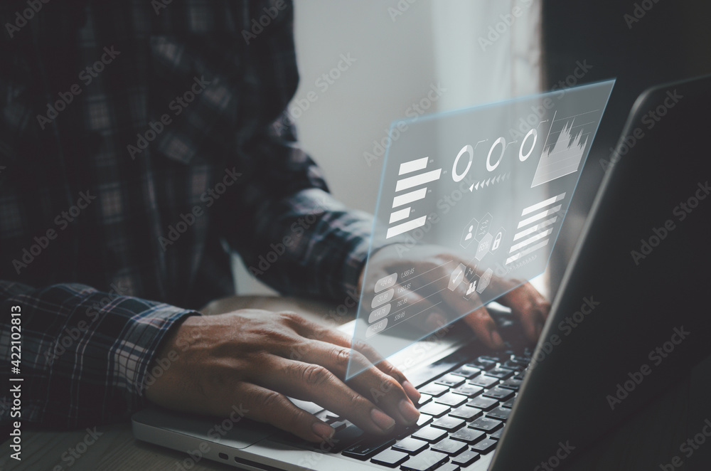 business man typing computer keyboard screen digital icon graph and chart. business on virtual screen and technology concept.