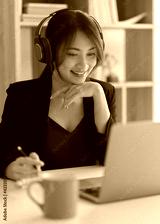 Happy businesswoman smiling and using headphone while working with laptop