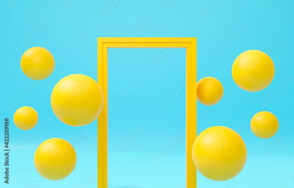 3D render of abstract blue background. Minimal yellow door with bubble.