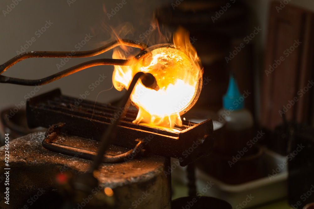melting with blow torch and foundry of liquid silver from a bowl into a mold