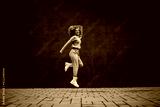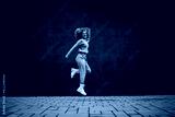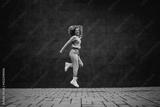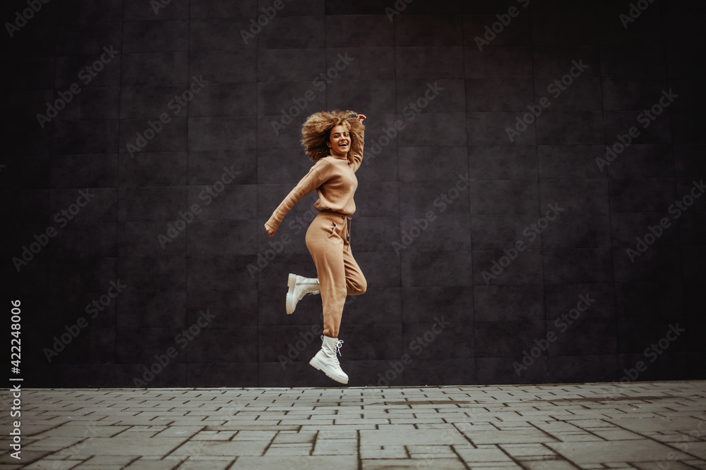Full length of cheerful hip hop girl in tracksuit jumping in place.