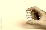 Hand in protective glove holds Covid-19 Vaccine glass vial.