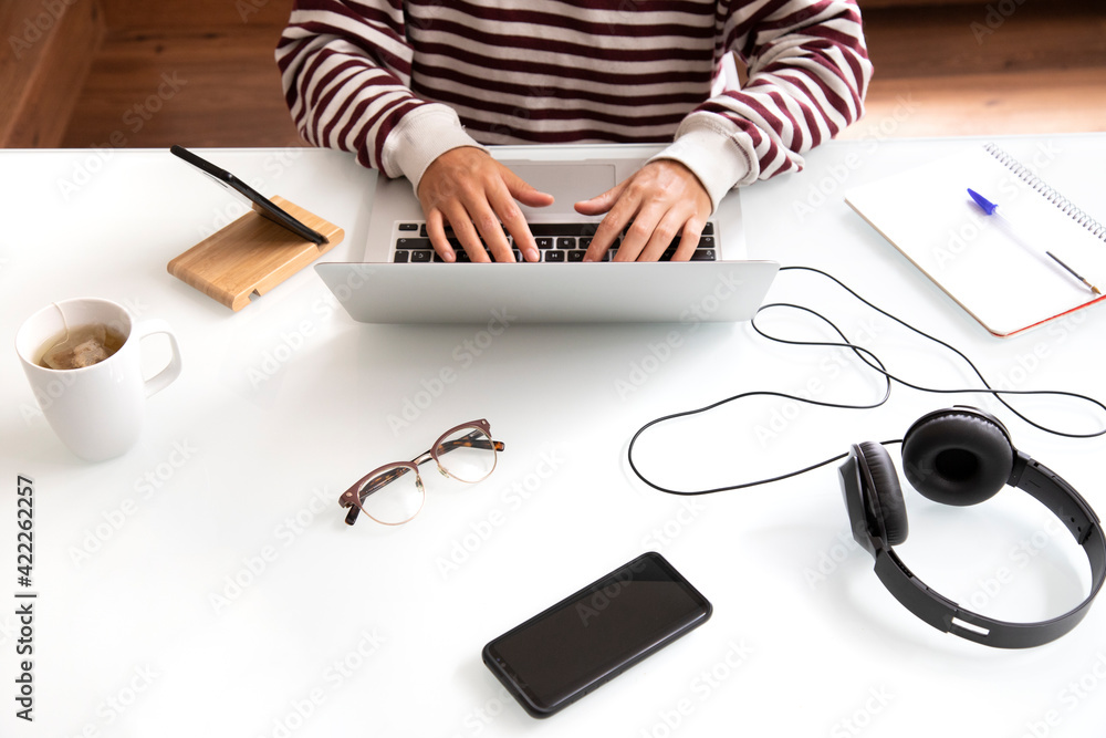 girl in a red and white striped sweater working on a computer at a white desk from her home