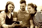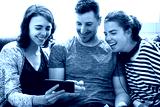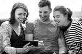 Group of friends having fun and laughing watching a video on the phone in a bright room. Concept technology. Lifestyle concept.