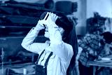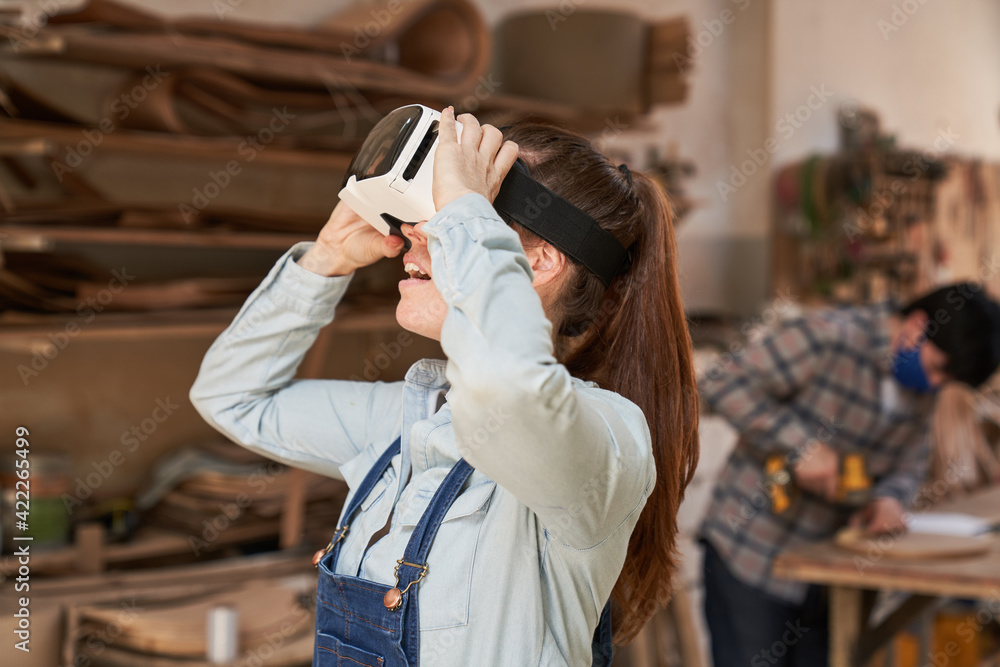Junge Frau als Handwerker Azubi mit VR-Brille