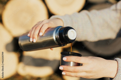 Close up of female hands pouring a hot drink in mug from thermos. Girl drinking tea or coffee during hike.