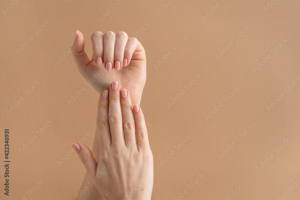 Hands of a beautiful well-groomed woman with feminine nails on a beige background. Manicure, pedicure beauty salon concept. Empty space for text or logo. On nails nude gel polish