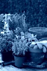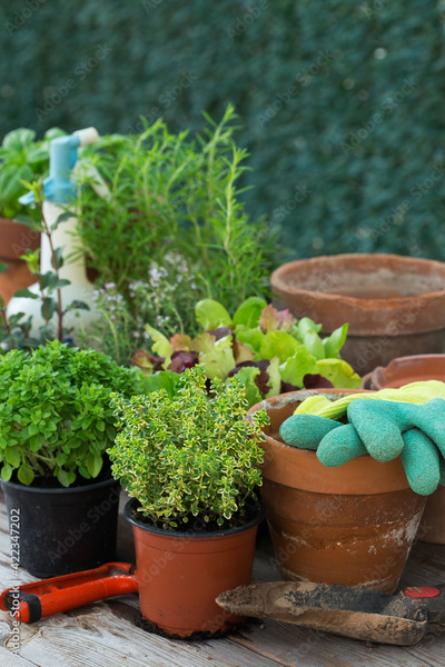 Assortment of spicy herbs and lettuce for planting urban garden