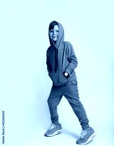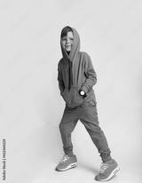Little boy model wearing sports tracksuit with sweatshirt and pants. Portrait isolated on gray background. Male child posing for camera with hands in pocket. Autumn spring sport children fashion