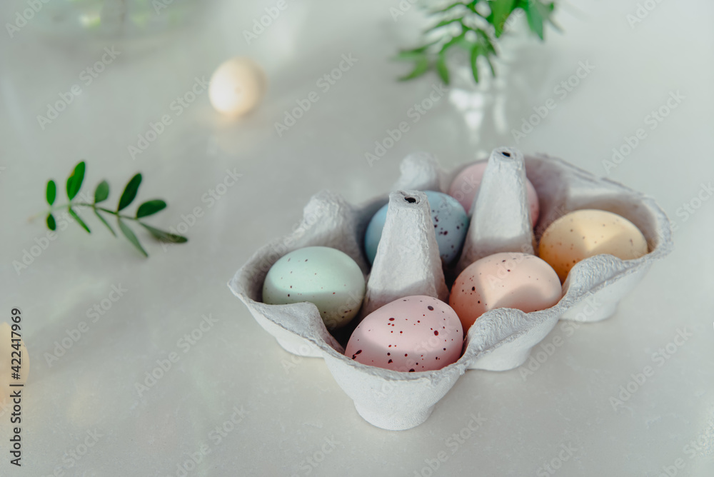 Easter holiday concept. Pastel colors painted eggs in cardboard box and with small fresh green leaves on white background. Soft natural light. Festive spring mood. Easter natural decor. Copy space.