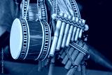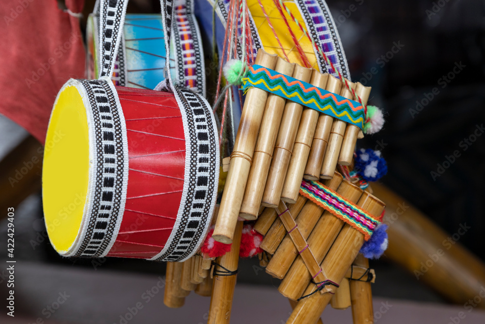 colorful and handmade musical instruments hung in a shop, detail of the drum and pan flute, close-up of the objects